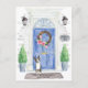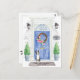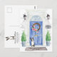 Mit unserer stilvollen Ankündigung kündigen Sie Ihre neue Adresse an: Boston Terrier, blaue Haustür, Begrüßungstafel, Schiefer-Schild, Topiaries und ein blumengeschmücktes Set auf grauem Backstein.