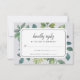 Die elegante botanische RSVP-Karte zeichnet sich durch grüne Aquarellfarben und Vintages Blattwerk aus, das Ihr gewünschtes UAWG und Ihre individuelle Akzeptanz und Ablehnung von Texten abbildet. Weiche graue Karten kehren zu tiefem Waldgrün um. Entworfen, um unsere Botanica Einladung Kollektion zu passen.