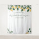 Lemon thematisierte Hochzeitstapestry mit botanischen Zweigen aus Wasserfarben Lemon ist die ideale Kulisse für Fotos. Im Hintergrund von Wedding Lemon finden Sie Vorlagen für Happily Ever After, die Braut- und Gräuelnamen und deren Hochzeitstermin.