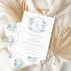 Tauchen Sie ein in raffinierte Eleganz und lassen Sie sich von dieser Viktorianischen französischen Hochzeitsveranstaltung verzaubern. Hier finden Sie anmutige Illustrationen von hellblauen und weißen Blume, die auf Vintagem Wappen mit einem Bräunungs- und Bräutigam-Mongramm im Inneren einen Kränz bilden. Diese Einladung ist die perfekte Wahl, um Ihrem Frühling- oder Sommerfest einen besonderen Charme zu verleihen.