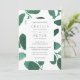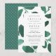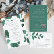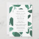Elegante botanische Hochzeitseinladungen in Aquarellfarben vermitteln Ihre Hochzeitsdetails in klassischer Schrift, gerahmt von Aquarellfarben-Blätter in Smaragdtönen und Waldgrün.