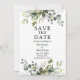 Die moderne Elegant Watercolor Botanical Greenery Save the Date Card beinhaltet Eukalyptus-Blätter, grünes botanisches Blattwerk, staubblaue Blätter und andere wunderschöne botanische Pflanzen.