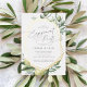 Die Einladungen zu den Themenveranstaltungen zum Thema Natur sind mit grauer Schrift gerahmt, die durch eine geometrische Goldfolie und zarte Aquarellbilder von mediterraner Vegetation, Blätter, Oliven und Zitronen geprägt ist. Eine moderne Wahl in einem natürlichen Farbschema für boho- oder naturgetreue Verlobungen.