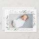 Elegante botanische Geburtsankündigung in eleganten Pastellfarben mit einem Single voll blutgefärbtem horizontales oder landschaftsorientiertes Foto mit Haufen von zarten, blassgrünen Aquarellfarben-Blätter an den Ecken. Personalisieren Sie Ihre Daten mit dem Namen des Babys, den Geburtsstatistiken und einer persönlichen Nachricht, und fügen Sie drei zusätzliche quadratische Fotos hinzu.
