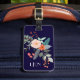 Ein buntes Spray von botanischen grafischen Blume schmückt dieses Gepäckanhänger und kann mit drei Monogramm-Initialen und Ihren Kontaktinformationen auf der Rückseite personalisiert werden. Der Hintergrund ist ein reichhaltiges Marineblau.