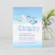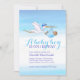 Joli invitation baby shower, avec la peinture à l'aquarelle mignonne d'une cigogne lunatique livrant un nouveau bébé garçon. Invitations Whimsical nouveau bébé garçon bébé douche bébé. Personnalisez avec vos détails de baby shower. © Uniquement peint en aquarelle et dessiné par Sarah Trett.