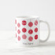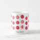 Une tasse avec des boules de Noël rouges et blanches et un texte "Joyeux Noël". Customisez la tasse avec votre propre texte, couleur arrière - plan entre autres options.