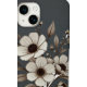 Un bouquet de fleurs avec de grandes fleurs blanches ouvertes aux centres sombres, entourées de divers feuilles et de petits éléments floraux. L'illustration est réalisée dans un style d'art monochromatique en ligne marron, mettant l'accent sur les détails complexes des pétales et du feuillage contre un arrière - plan simple.