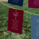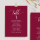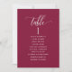 Aidez vos invités à trouver leur table avec cette élégante carte moderne de plan de salon avec les noms des invités. Cartes recto-verso pour que les clients puissent chercher leur nom à l'avant ou à l'arrière. Libérez de l'espace tout autour en vous donnant la liberté d'utiliser des clips ou un trou de perforation pour accrocher des écrans, ou d'utiliser le support/cadre de table. Arrière - plan de Bourgogne et texte blanc. Détails de calligraphie manuscrite moderne. Plusieurs options de couleur. Ayez tous les numéros de table dans la même couleur ou mélangez les couleurs selon le thème de couleur de votre événement. Une partie de notre collection "Berry, Blue and Burgundy Floral".