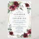 Le design présente un cadre géométrique imprimé de couleur or avec des éléments floraux dans les tons bordeaux, rouge et rougissant sur la verdure, l'eucalyptus et les fleurs.