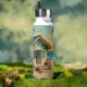 A pretty impasto beach themed water bottle with a cute beach house, palm trees and tropical flowers.