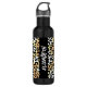 Un empreinte de léopard amusant entoure cette bouteille d'eau en acier inoxydable noir personnalisée avec votre nom imprimé verticalement en lettrage chic.