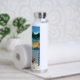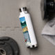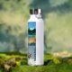 Un magnifique paysage avec des couleurs et des textures uniques montrant un paysage de montagne et de lac et une forêt multicolore avec un soleil levant et un orignal dans les tons de bleu, vert, or, et magenta.