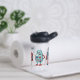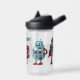 Restez hydraté dans le style de science-fiction avec cette bouteille d'eau amusante. Il présente de jolies illustrations de robots de style rétro dans les tons rouge et bleu et est prêt à être personnalisé avec un nom en lettres bleu marine. Les graphismes entourent la bouteille.