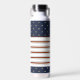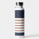Un motif simple rayé aux accents de pois. Cette bouteille d'eau présente une ligne rouge gras avec une ligne verte plus fine, de chaque côté. Cette combinaison alterne avec une règle noire de cheveux et une bande blanche épaisse. En haut et en bas de ce design il y a un bloc de marine, avec des points dorés.