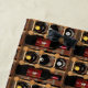 Voici une serviette de plage très cool, avec un motif abstrait répétitif de bouteilles de vin bordeaux dressées rouges et noires, à côté d'autres bouteilles dans un porte-vin en bois brun, or et jaune. Un arrière - plan rustique orangé en brique complète la composition.
