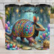 Il s'agit d'une illustration fantaisiste et vibrante d'un armadillo avec une coquille faite de bijoux et de pierres précieuses multicolores, explorant une grotte mystique. L'armadillo est entouré de cristaux scintillants et de rochers. L'arrière - plan présente des sculptures complexes et un passage lumineux menant plus profondément dans la caverne magique. Un coffre au trésor est visible en bas à droite, ajoutant un sentiment d'imaginaire et d'aventure.