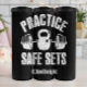 Ce graphique original présente une illustration humoristique d'une cloche à cloche avec une bouillotte au milieu. Le design comprend le texte plein d'esprit "PRACTICE SAFE SETS", créant une pièce amusante, motivante et remplie de jeux de mots pour quiconque aime l'haltérophilie.
