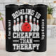 Ce graphique humoristique présente un ensemble de broches de bowling et une boule rouge. Le design a une sensation vintage et désespérée et comprend le texte spirituel "BOWLING IS CHEAPER THAN THERAPY", créant un graphique simple et amusant pour un parfait pour un bowler passionné.