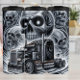 Cette image monochromatique présente un puissant semi-camion noir avec des détails argentés stylisés et tourbillonnants, sur fond de fumée blanche fantomatique et tourbillonnante et de nombreux crânes menaçants de tailles diverses. Les crânes semblent émerger de la brume fumée, créant une atmosphère sombre et gothique autour du camion.