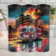 Cette illustration spectaculaire représente un camion de pompiers stationné sur une route humide devant un grand bâtiment englouti dans les flammes. Le ciel est un crépuscule foncé, contrastant avec l'orange vif et le jaune du feu. Le camion de pompiers a ses lumières clignotantes, et les reflets du feu et des lumières sont visibles sur la surface de la route humide, créant un sentiment d'urgence et de chaos.