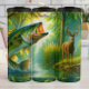 Cette illustration représente une grosse basse qui saute dramatiquement d'un plan d'eau au premier plan, avec sa bouche ouverte. L'eau s'écoule autour du poisson, et des ondulations s'étendent à la surface. Sur la rive droite, un cerf brun aux bois de bois se dresse au milieu du feuillage vert et des hautes herbes jaunes, en regardant vers le spectateur. L'arrière - plan est doté d'une forêt luxuriante et dense, où la lumière du soleil filtre à travers les arbres, créant une scène extérieure lumineuse et naturelle.