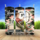 Une femme joyeuse avec une queue de cheval, vêtue d'une chemise en plaid et d'un pantalon de camo aux accents de feuilles, se trouve à la porte arrière d'un pick-up blanc. Elle tient un arc et une flèche, en incarnant l'expression "Chasse comme une fille ET REGARDE MIGNON LE FAIRE" emblazée sur un arrière - plan de camouflage. Le style général est fantaisiste et habilitant.