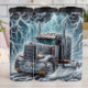 Cette image montre un puissant semi-camion chromé qui roule à toute vitesse sur une route lors d'une violente tempête de foudre. Des éclairs blancs et bleus éclatent les nuages sombres et orageux qui entourent le camion. L'eau s'écoule autour du véhicule au fur et à mesure qu'il avance, ce qui souligne l'intensité du temps et la présence de force du camion.