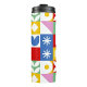 This colorful water bottle features a bold, modern geometric pattern that instantly stands out. Each square on the bottle showcases a different playful shape—circles, petals, lines, and abstract motifs—arranged in a lively mosaic of red, blue, green, yellow, pink, and white. The bright, high‑contrast palette gives it a cheerful, artistic vibe, while the sleek black top adds a clean, contemporary finish. It’s a fun, expressive accessory for staying hydrated in style.