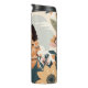 Illustration sereine montrant une femme en robe bohème à motifs debout au milieu d'un jardin luxuriant de fleurs surdimensionnées dans un style de bloc de couleur abstrait. Le design présente une palette de couleurs chaudes et terreuses de terre cuite, pêche, marine et vert sauge. Cette illustration botanique moderne combine des éléments d'art folklorique avec un design contemporain, parfait pour les amateurs d'art botanique avec une touche féminine. Les fleurs stylisées et le feuillage créent une atmosphère rêveuse et fantaisiste tout en maintenant une esthétique sophistiquée.
