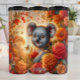 Cette belle illustration présente un koala mignon à l'expression innocente, encadré par une arche vibrante de roses et d'autres fleurs dans les tons rose et orange. L'arrière - plan est un coucher de soleil doux, et quelques papillons sont visibles. La scène a une atmosphère romantique et charmante, célébrant la nature et la gentillesse.