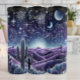Cette illustration enchanteresse représente un paysage désertique serein sous un ciel nocturne époustouflant. Des cactus en saguaro silhoués se dressent contre des dunes violettes ondulantes, éclairées par une lumière brillante et montante à l'horizon. Ci-dessus, une pleine lune détaillée, une lune de croissant, de nombreuses étoiles et constellations créent un panorama céleste magique.