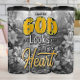Ce graphique fascinant présente "DIEU" et "Coeur" dans une typographie jaune vibrante et texturée, avec "Looks At The" en blanc contrasté. Un petit détail de croix orne le "Coeur". Le message puissant est placé contre un paysage en niveaux de gris serein de montagnes, d'eau et de fleurs comme des lis, créant un design visuellement saisissant et spirituel.