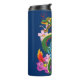 Un dragon chinois vert avec un koi orange avec fleurs de lotus et fleurs de cerisiers sur fond de bleu foncé.