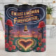 Ce graphique fantaisiste présente un coeur de feu sur une passerelle, flanqué de bornes d'incendie stylisées avec casques. La scène est un hommage romantique avec des roses rouges et un ciel brillant, avec le texte "I'M Just A WOMAN Who LOVES SON FIREFIGHTER".