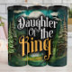 Ce graphique inspirant déclare fièrement "Fille du Roi" dans des polices élégantes et contrastées, avec "Roi" rendu dans un jaune doré éclatant. Le texte est magnifiquement dressé contre un paysage nocturne serein et stylisé avec des montagnes superposées, des arbres à feuillage persistant abondants et une lune lumineuse. Encadré par une tiède verte, il symbolise l'identité et l'appartenance spirituelles.
