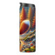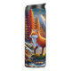 Cette illustration pittoresque représente un renard rouge avec une queue molle à pointes blanches qui traverse soigneusement les rochers dans une rivière peu profonde. Le paysage environnant est une forêt automnale vibrante avec des arbres dorés, des montagnes enneigées au loin et des feuilles oranges tombant sous un soleil lumineux, pleine lune ou couchant. La scène capture la beauté sereine de la nature à l'automne.