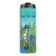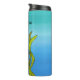 Cette bouteille thermale tumbler pour garder vos boissons froides ou chaudes a un joli cheval de mer imaginaire qui est une couleur bleu vert avec l'estomac blanc avec sa queue enveloppée d'algues vert vif sur un arrière - plan bleu et couleur aqua. Customisez votre texte avec le modèle.