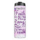 Cette image présente une citation relevée contre un arrière - plan floral vibrant de fleurs violettes et de points éparpillés, avec des papillons délicats rose et violet qui clignote autour. Le texte "La foi ne rend pas les choses faciles, elle les rend possibles" est rendu dans un script élégant, principalement dans les tons violets. La conception d'ensemble transmet un message d'espoir, de résilience et d'encouragement spirituel.