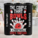 Ce graphique présente une boule de bowling rouge et cinq broches, avec une texture grungy et en détresse. Le design inclut le texte plein d'esprit "LE COUPLE QUI ENSEMBLE RESTE ENSEMBLE", créant un graphique simple et amusant pour un parfait pour un couple qui aime bowl ensemble.