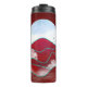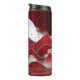 aménagement paysager Abstrait dans différentes nuances de rouge avec une lune, des collines, des arbres, des nuages et des oiseaux.