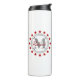 Ce tumeur thermique présente votre monogramme en gris dans un cercle encadré de points noirs et de doubles lignes noires. A l'extérieur du cadre noir se trouve un cercle d'étoiles rouges vives. Votre nom est écrit en rouge correspondant sur le monogramme du centre gris. L'image et le texte sont de deux côtés. Très distinctif !