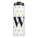 Pois violets sur arrière - plan blanc. Personnalisez avec votre initiale monogrammée en texte noir au centre du cercle jaune. Cercles géométriques branchés sur tumblers pour votre style unique. Amusant pour tous ceux qui aiment les points. Conception originale © TamiraZDesigns. www.zazzle.com/tamirazdesigns