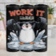 Ce dessin humoristique présente un manchot à l'aspect déterminé qui soulève une grande cloche. L'image comprend le texte de motivation 'WORK IT' en haut, créant un design drôle et énergique qui célèbre le dur travail et la persévérance avec une torsion ludique.
