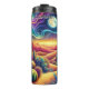 Cette illustration surréaliste dépeint un paysage désertique vibrant sous une pleine lune et un ciel tourbillonnant et coloré comme des aurores rempli d'étoiles. Différents types de cactus et de flore désertique dans les teintes psychédéliques peuplent les dunes de sable et le terrain rocheux, créant une scène onirique et autre.