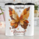 Ce graphique présente un papillon avec des ailes en feuilles d'automne dans différentes nuances d'orange et de marron. Deux petites croix en bois sont disposées de chaque côté du papillon. Le texte "Renouvelé dans son amour" est écrit ci-dessous dans un script élégant, créant un design magnifique et spirituellement symbolique.