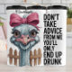 Cette illustration graphique excentrique présente une autruche stylisée avec un grand arc rose sur la tête, surplombant une clôture en bois. Le texte à droite dit : "NE PRENEZ PAS DE CONSEILS DE MOI, VOUS FINIREZ SEULEMENT PAR BOIRE." L'art a un ton amusant, fantaisiste et humoristique, parfait pour une fête