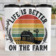 Il s'agit d'un design graphique rustique avec un thème agricole. L'image centrale présente une grange noire avec moulin à vent et est située dans un champ labouré avec une clôture en bois et des faisceaux de blé. L'arrière - plan est un coucher de soleil animé avec des rayons de soleil et des nuages de couleurs variées. L'expression "LIFE IS BETTER ON THE FARM" est affichée en haut et en bas de la scène dans une police patinée et audacieuse.