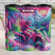 Un VTT solitaire en costume rose vif et casque se promène à travers un paysage psychédélique et très coloré. Des montagnes enneigées s'élèvent au loin, tandis que des motifs tourbillonnants et des teintes vibrantes de rose, de violet, de bleu et de vert saturent la forêt fantastique et l'eau qui coule, créant une aventure hors-route d'un autre monde et exaltante.