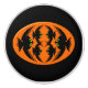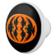Ce superbe bouton en céramique présente un ovale orange avec six corbeaux. Chaque corbeau a des yeux jaunes avec des élèves noirs et des ailes étirées. Les corbeaux volent vers l'autre formant une forme ovale. L'arrière - plan est noir.